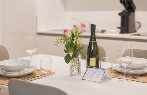 The apartment consists of a kitchen equipped with an induction hob, refrigerator, dishwasher, microwave, Nespresso coffee machine and kettle.