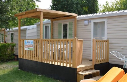 "Happy Premium", 4-room mobile home 30 m2. Comfortable furnishings: living/dining room with electric heating and air conditioning. 1 room with 1 french bed (140 cm, length 190 cm). 2 rooms, each room with 2 beds (70 cm, length 190 cm). Open kitchen (4 hot plates, microwave, freezer, electric coffee machine). Shower/WC. Air-conditioning (extra). Terrace partly roofed. Terrace furniture, barbecue (portable), deck chairs (2). Facilities: mosquito net. Reserved parking (1 car). Please note: non-smokers only. 017171-CAM-0004