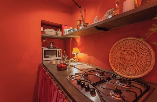 The Apartment: This apartment stands out for its warm and enveloping atmosphere, with a predominant red color that runs through every room, creating a space full of character. The walls and dark wood details add a touch of rustic elegance and intimacy, giving the home a feeling of warmth and comfort. The bedroom is the heart of the house, furnished with a large double bed of simple yet refined design. Beside it, a spacious wardrobe offers plenty of room to store your personal belongings. The most unique feature of this room is a wooden staircase next to the bed, which leads to the upper floor, where you’ll find a well-organized kitchen. This layout offers an exclusive fusion of comfort and functionality, allowing for an optimal use of space.