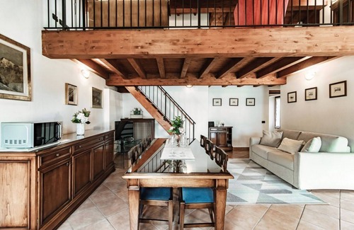 An oasis of peace overlooking the lake in a country-style apartment, you will be enchanted by the ceiling with original wooden beams and the bright mezzanine area