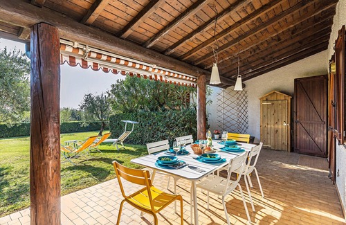 The apartment, located on the ground floor and which spreads over two levels, welcomes guests from the bright living room equipped with sofa, TV, dining table and open kitchen complete with all amenities, including oven, dishwasher, microwave, kettle and American coffee maker. The living room overlooks the large covered porch, equipped with a second dining table and deck chairs, ideal for enjoying sunny days in the open air. A bedroom equipped with a queen-size bed and closet, a second bedroom with two single beds and a bathroom with shower complete the floor. Stairs lead to the lower floor where there is a spacious taverna furnished with a comfortable double sofa bed, a second sofa and a table with chairs. A second bathroom with shower completes the layout.