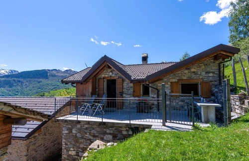 3-room house 32 m2, south facing position. Rustic and cosy furnishings: living/sleeping room with 1 double sofabed, open-hearth fireplace, dining table, satellite TV and wood-burning stove. Exit to the terrace. 1 room with 1 french bed (160 cm). 1 room with 1 x 2 bunk beds. Open kitchen (Gas stove, 4 gas rings). Shower/WC. Wood heating. Solar power Heating not available in all rooms. Terrace. Terrace furniture, deck chairs (2). Marvellous panoramic view of the lake and the mountains. Facilities: children's high chair, baby cot. Maximum 2 pets/ dogs allowed. IT013178C2FIJLQOZ6