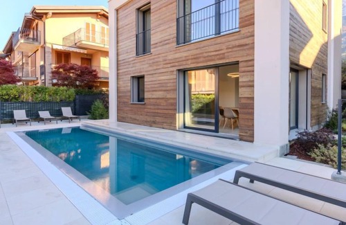 Large, modern house "Uliveto", 3 storeys, built in 2023. 650 m from the centre of Colico, 38 km from the centre of Lecco, 69 km from the centre of Como, in a central, elevated position, 700 m from the lake. Private: property 300 m2 (fenced) with lawn, swimming pool angular (3 x 8 m, depth 140 cm, seasonal availability: 01.Apr. - 30.Oct.). Outdoor shower, pool maintenance by the owner/gardener. In the house: storage room for bicycles. Linen change (suppl. charge extra). Room cleaning on request (extra). Parking (for 3 cars) on the premises, single garage. Supermarket 1.5 km, restaurant 450 m, bar 500 m, bakery, pedestrian zone 600 m, bus stop 900 m, railway station "Colico" 1 km, ferry 600 m, grass beach "Lido di Colico" 700 m. Golf course (18 hole) 37 km, surf school 1.5 km, riding stable 3.4 km, children's playground 1.1 km. Nearby attractions: Forte Montecchio Nord, Abbazia di Piona, Torri di Fontanedo. Well-known ski regions can easily be reached: Madesimo, Livigno. Well-known lakes can easily be reached: Lago di Mezzola. Hiking paths: Pian di Spagna, Monte Legnone. The owner does not accept any youth groups.