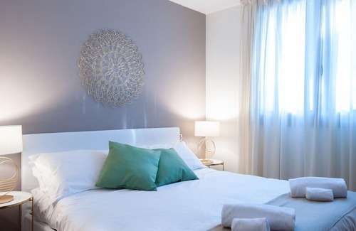 The apartment opens onto a nice day area, offering ample views of the reception's small garden and comprises a fully-equipped open kitchen (with induction cooktop, fridge, microwave, washing machine and dishwasher), a dining area with a wooden table with 5 chairs, and a relaxation corner featuring a comfortable double sofa bed, a pouf, a coffee table, a TV set and some shelves.